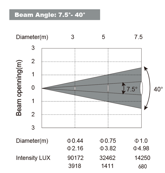 Ángulo de haz: 7,5° a 40°