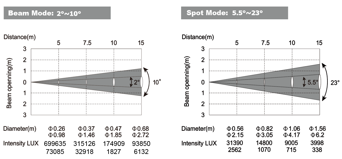 Flujo luminoso: 10435 lúmenes, 699635 lux@5m@2°haz,31390lux@5m@5.5°modo puntual